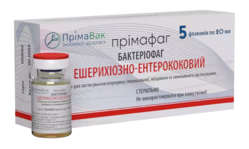 - 1 vial (20 ml) contains a sterile solution of bacteriophagus (sterile mixture E.coli та/або Enterococcus: Ent.faecalis, Ent.faecium, Ent.durans with the concentration of phage particles at least 105 microorganisms/ml.