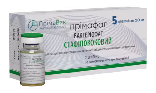 - 1 флакон (20 мл) містить стерильний розчин бактеріофагу (стерильна суміш очищених фільтратів фаголізатів бактерій), що викликає специфічний лізис бактерій роду Staphylococcus (Staphylococcus aureus, Staphylococcus haemolyticus, Staphylococcus hominis, Staphylococcus hyicus, можливо також Staphylococcus cohnii, Staphylococcus сарitis, Staphylococcus intermedius), з концентрацією фагових частинок не менше 105 БУО/мл.